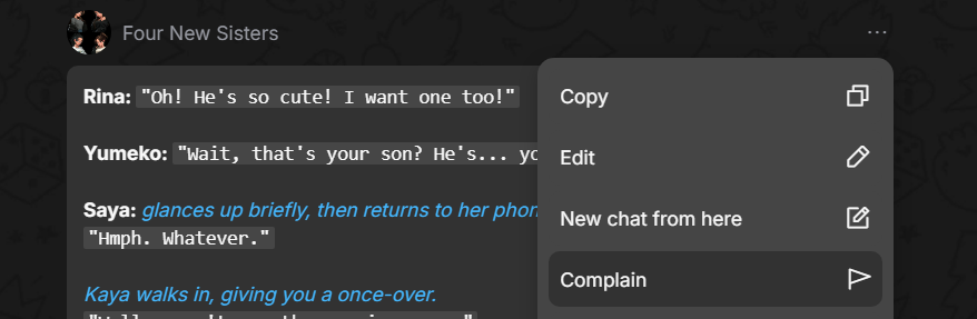 If you believe a character’s message is inappropriate, offensive, or violates community guidelines, report it. Click the three dots in the top-right corner of the message and select . In the window that appears, choose a reason from the list and describe the issue.