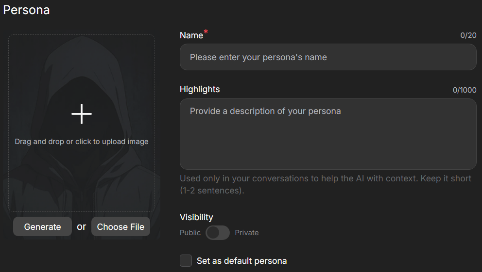 Key details may include style, mood, appearance, or role. One or two sentences are often enough to ensure characters accurately reflect your persona.